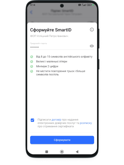 Enter the SmartID password. The key is created! In the “Settings” menu, you can connect the biometric SmartID signature so you can use it in a more convenient and secure way.