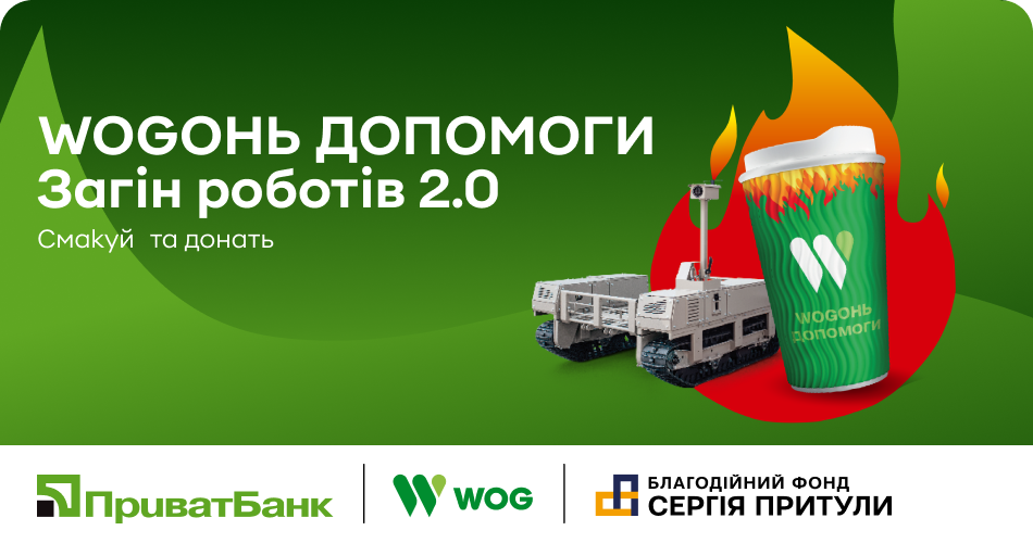 Мережа АЗК WOG, Благодійний фонд Сергія Притули та ПриватБанк запускають проєкт «WOGОНЬ ДОПОМОГИ. Загін роботів 2.0». Його мета: вже вдруге зібрати «загін» наземних роботизованих комплексів.