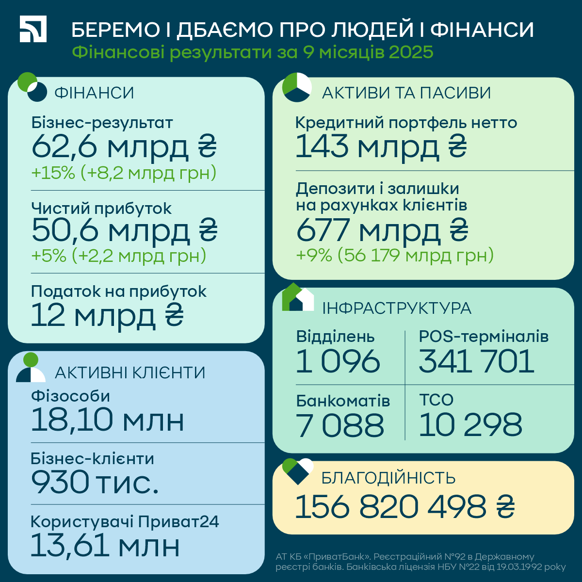За 9 місяців роботи ПриватБанк звітує про 50,6 млрд грн чистого результату після вирахування податку на прибуток 25%. Бізнес-результат без переоцінок, резервів під кредитні ризики та податків досяг 62,6 млрд грн, збільшившись на 15% порівняно з аналогічним періодом 2024 року. ПриватБанк посідає перше місце на ринку за рівнем прибутковості, формуючи понад 43,5% прибутку банківського сектора до оподаткування. Ці результати яскраво свідчать про стійкість обраної бізнес-моделі, впевнене зростання операційної ефективності та стабільність банку попри зовнішні виклики.