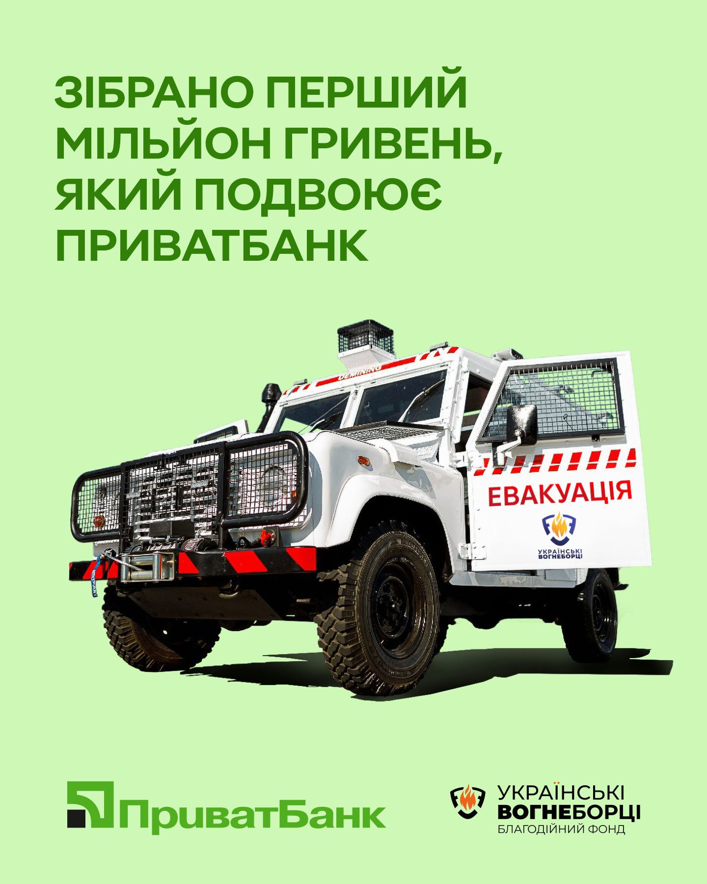 ПриватБанк підтримав благодійну ініціативу, подвоївши перший мільйон гривень у рамках спільного збору коштів із «Благодійний фонд Українські Вогнеборці» на придбання броньованого евакуаційного автомобіля для потреб Державної служби України з надзвичайних ситуацій (ДСНС).