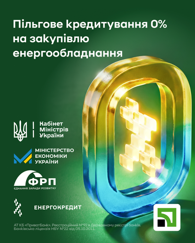 ПриватБанк став учасником державної програми, яка дозволяє бізнесу брати безвідсоткові кредити на купівлю генераторів і акумуляторних батарей та іншого обладання.