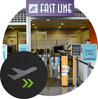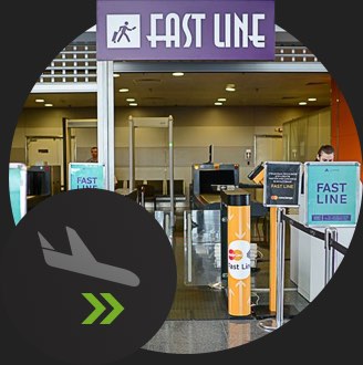 Проходьте авіаційну безпеку та паспортний контроль через окремий безкоштовний* коридор FastLine. Дозволяється 1 прохід на добу для власника картки. На картці під час проходу блокується 1 грн, яка потім повертається.